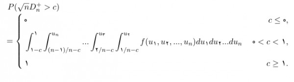 \begingroup\makeatletter\def\f@size{10}\check@mathfonts‎ \begin{align*} &P(\sqrt{n} D_n^ + > c)\\ & = \begin{cases} ‎\LR {$‎‎0‎$‎} &\hspace*{0.1cm} c \le 0\\ \int_{1 - c}^1 \int_{(n - 1)/n - c}^{u_n} \cdots \int_{2/n - c}^{u_3} \int_{1/n - c}^{u_2} f(u_1, u_2, \ldots, u_n) d u_1du_2 \ldots du_n &‎\hspace*{0.1cm}‎ 0 < c < 1\\ \LR {‎$‎1‎$‎} &\hspace*{0.1cm} c \ge 1 \end{cases} \end{align*} ‎\endgroup‎