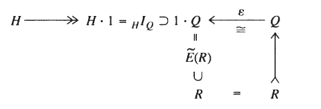 H \ar@{>>}[r] & H\cdot 1= {_H}{I}{_Q} \supset 1\cdot Q & & Q \ar@{>>}[ll]_-{\epsilon}^-{\cong} \\