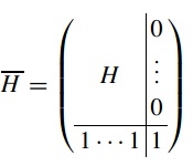 \[ \overline{H}=\left( \begin{array}{c|c} 1 \cdots 1 &1 \\ \hline & 0 \\[-1mm] \raisebox{-5pt}{{\huge\mbox{{$H$}}}} & \vdots \\[-1mm] & 0 \end{array} \right) \]