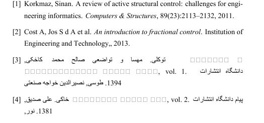 در هنگام استفاده از مراجع فارسی در پایان نامه خروجی به شکل عکس زیر نمایش داده می شود. در واقع خروجی مراجع انگلیسی بدون هرگونه ایرادی وجود دارد ولی منابع فارسی به این شکل نشان داده میشوند. سعی کردم در این فایل کمینه که درست میکنم مشکل رو به صورت ساده تر نشون بدم. ممنون از راهنماییتون