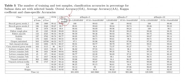 \caption{The number of training and test samples, classification accuracies in percentage for PaviaU data set with extracted bands. Overal Accuracy(OA), Average Accuracy(AA), Kappa coefficent and class-specific Accuracies}