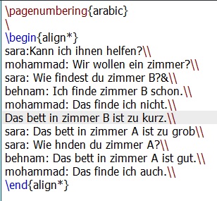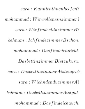 اگر از بستهٔ زیپرشین هم استفاده میکنید باید محیط latin را هم در نظر بگیرید. اما به نظر من روشی که شما برای نوشتن یک گفتگو در نظر دارید از ریشه غلط است. بستهٔ dramatist برای نوشتن نمایشنامه طراحی شده است و میتوانید از آن استفاده کنید. نمونهٔ زیر کاربرد این بسته را به همراه زیپرشین نشان میدهد: