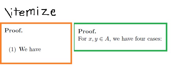 همونطور که میدونین، محیط proof رو به این صورت تغییر دادیم که از خط جدید شروع بشه! از طرفی، محیطهایی مثل: enumerate، itemize وغیره، خودشون از خط جدید شروع میشن؛ پس وقتی یک محیطی مثل enumerate داخل محیط proof نوشته میشه، بالاش یک خط خالی ایجاد میشه. همچنین محیطهای لیستوار، بهصورت پیشفرض، اندکی فاصله قبل و بعدشون اضافه میکنن که از متن معمولی متمایز باشند.