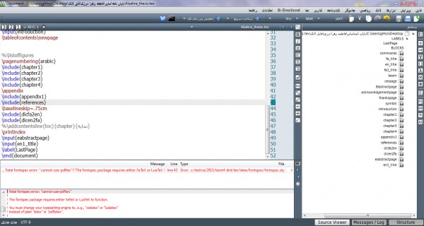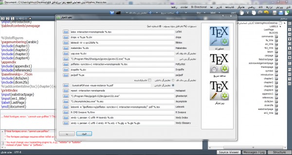 بنده برنامه texlive و biditexmaker و فونت های لازم رو نصب کردم. موقع کار خروجی نمیده و حتی فایل لاتک دانشجوهایی که دفاع کردن (منظور سالم بودن فایل لاتک و درستی دستورات) رو هم خروجی میگیرم erorr میده.فایل لاتک رو و erorr مربوطه رو پیوست می کنم. البته بعد نصب تنظیمات پیش فرض رو دست نزدم و حالت تنظیمات رو هم پیوست کردم.