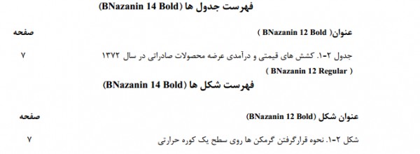با سلام. دانشگاه ما برای پایان نامه استایل جالبی داره که من هرکاری میکنم نمیتونم با زیپرشین انجامش بدم. مشکل من در تنظیم فهرست مطالب، شکل ها و جدول است. لازمه که مطابق فایل پیوست Fehrest.PNG و jadval_shekl.PNG باشه.