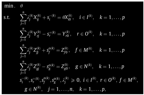 \mathrm{s.t.} &\mathop\sum \limits_{j=1}^n\lambda _j^{(k)}X_{ij}^{(k)}+s_i^{-(k)}= \theta X_{io}^{(k)},\ i\in I^{(k)},\ k=1,\cdots ,p, \\