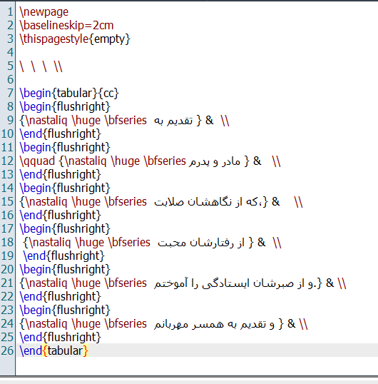 سلام، من تقدیم پایان نامه رو توی محیط tabular نوشتم، خروجیش خوبه ولی ارور میده!!کدش رو پیوست میکنم، واسه راست چین شدنش این کاری که کردم درسته؟