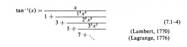 {\tan ^{ - 1}}(x) = \frac{x}{{1 + \frac{{{1^2}{x^2}}}{{3 + \frac{{{2^2}{x^2}}}{{5 + \frac{{{3^2}{x^2}}}{{7 + \frac{{}}{ \ddots }}}}}}}}}