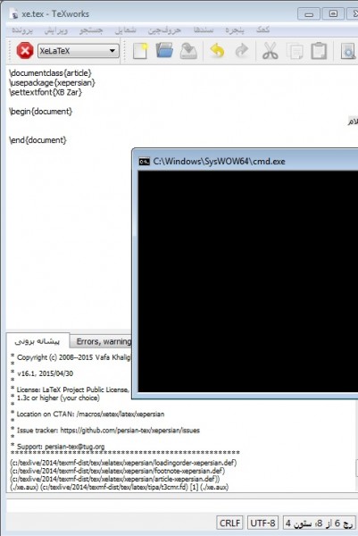 اما وقتی حتی کمینه ترین فایل فارسی رو با بسته xepersian و با گزینه XeLatex اجرا میکنم فایل cmd.exe از دایرکتوری C:\windows\SysWow64 اجرا میشه.