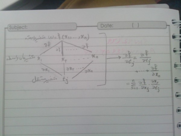 \begin{tikzpicture}\xymatrix{ w = f( x_{1} , x_{2} , \dots , x_{n} ) \ar[d]_{\dfrac{\partial f}{\partial x_{2}}} \ar[dr]_{\dfrac{\partial f}{\partial x_{n}}}\ar[dll]_{\dfrac{\partial f}{\partial x_{1}}} & & \\
