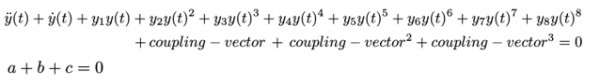 \ddot y(t) + \dot y(t) + {y_1}y(t) + {y_2}y{(t)^2} + {y_3}y{(t)^3} + {y_4}y{(t)^4} + {y_5}y{(t)^5} + {y_6}y{(t)^6} + {y_7}y{(t)^7} + {y_8}y{(t)^8} \\
