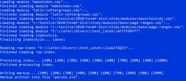 برای اجراکردن، بایستی دستور xindy با متعلقاتش رو برای هر نمایه به کار ببریم؛ ما تو این نمونه کد، چهار نوع نمایه داریم: اسم‌ها (person.idx)، مکان‌ها (place.idx)، سندها (doc.idx)، و بدون نام (example.idx). اجراهای لازم: