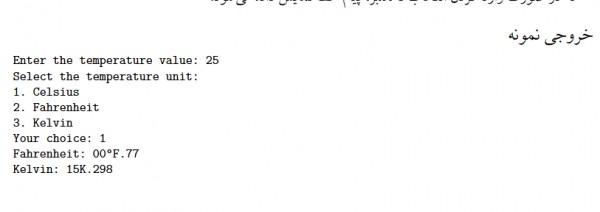 \item اگر کاربر \lr{\texttt{Fahrenheit}} را انتخاب کند، دما به \lr{\texttt{Celsius}} و \lr{\texttt{Kelvin}} تبدیل می‌شود.