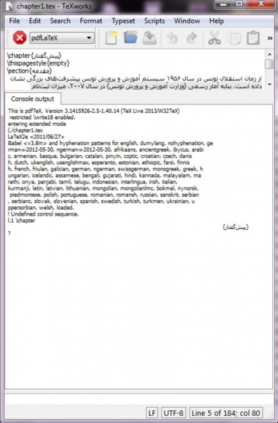 از پاسخ شما سپاسگزارم، فایل اصلی را پیدا کردم در حالت pdflatex می باشد وپنجره pdf-texword همزمان با آن باز می شوداما وقتی موتورپردازشگر را به xelatex تغییر می دهم و ctrl+t را می زنم خطای زیر نمایش داده می شود.