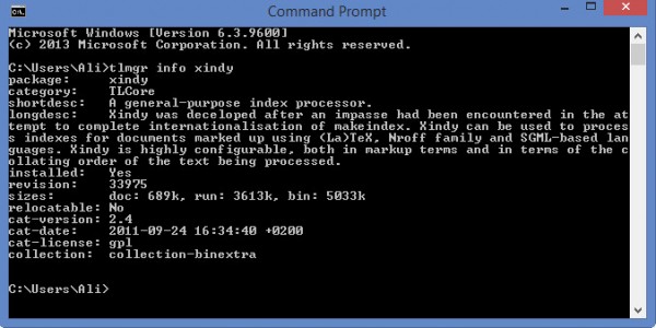 نتیجه اجرای دستور tlmgr info xindy ضمیمه شده است.