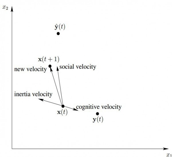 \شرح{نمایش هندسی بروزرسانی سرعت و مکان برای یک ذره در فضای دو بعدی}