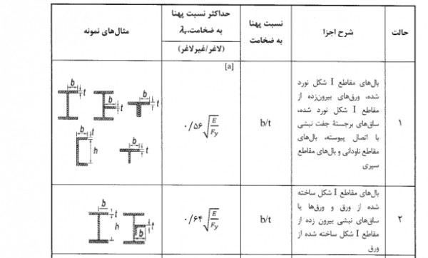۱ & بال‌های مقاطع \lr{I} شکل نوردشده، ورق‌های بیرون زده از مقاطع \lr{I} شکل نوردشده، ساق‌های برجسته‌ی جفت نبشی با اتصال پیوسته، بال‌های مقاطع ناودانی و بال‌های مقاطع سپری &