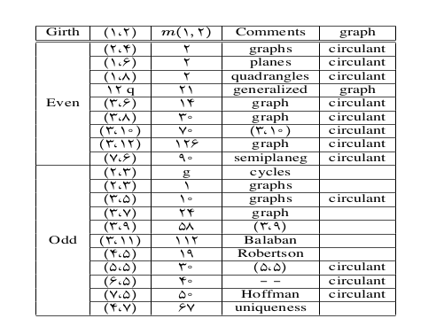 Girth & (1,2) & $ m(1,2) $ & Comments & graph \\