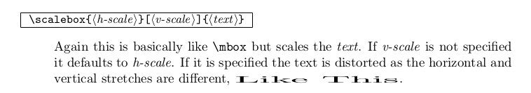 دستور \scalebox دو گزینه دارد. ر.ک. تصویر ذیل که از راهنمای بسته گرافیک گرفته شده است.