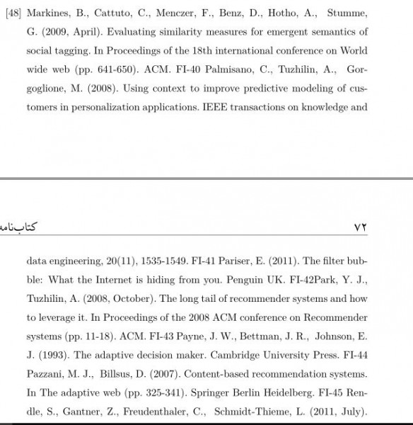 با سلام. خروجی رفرنس های پایان نامه ی من از شماره 48 به بعد به صورت متن پشت سر هم ظاهر میشه .