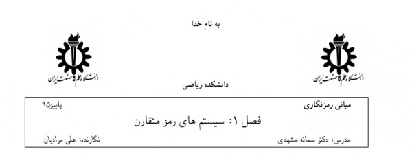 \handout{مبانی رمزنگاری}{1}{پاییز95}{سیستم های رمز متقارن}{علی مرادیان}