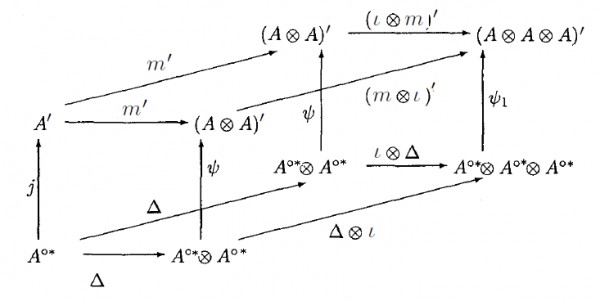 \node at (3,0)(b){$ A^{o*}\otimes A^{o*}$};