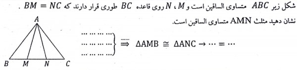 شکل زیر $ABC$ متساویالساقین است و $M$، $N$ روی قاعده $BC$ طوری قرار دارند که $.BM=NC$ نشان دهید مثلث $AMN$ متساویالساقین است.