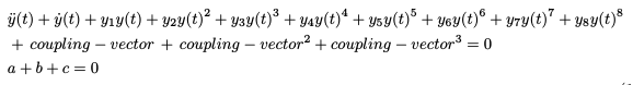 \ddot y(t) + \dot y(t) + {y_1}y(t) + {y_2}y{(t)^2} + {y_3}y{(t)^3} + {y_4}y{(t)^4} + {y_5}y{(t)^5} + {y_6}y{(t)^6} + {y_7}y{(t)^7} + {y_8}y{(t)^8} \\