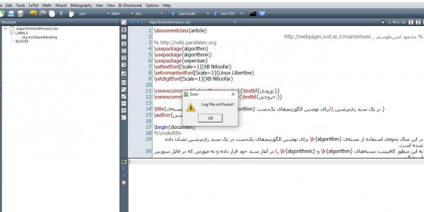 ۶- در اسم فایل یا مسیر کپی شدهی فایل tex، کاراکتر فارسی و نماد و فاصله پرانتز و ... است.