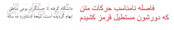 من یه متن فارسی رو از TeXstudio خروجی گرفتم ولی هر کاری میکنم حرکاتِ متن(فتحه، ضمه، کسره، تنوین و...) رو با فاصله زیادی نشون میده که توی مطالعه طولانی مدت باعث بدخوانی و خستگی خواهد شد.
