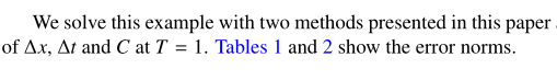 ‎	We solve this example with two methods presented in this paper and the Finite volume method with several values of $\Delta x$‎, ‎$\Delta t$ and $C$ at $T=1$‎. ‎\Autoref{tab:1003} and \ref{tab:1004} show the error norms‎.